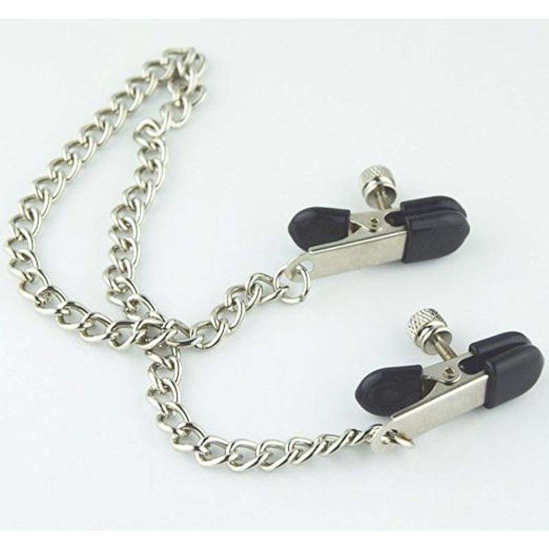 O prendedor de mamilos possui ajustes e guizo de metal.