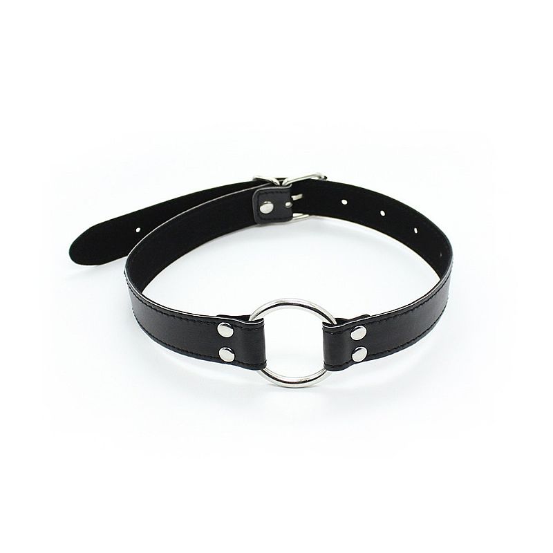 Mordaça bondage ajustável por meio de fivelas metálicas, confeccionada em couro sintético.